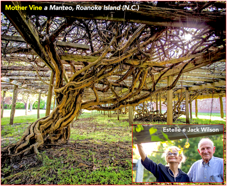 L’esploratore inglese Arthur Barlowe, sbarcato nel 1584 a Roanoke Island (siamo sempre nel North Carolina), fu colpito dal gran numero di viti che vi trovò e, nel suo resoconto al suo superiore Sir Walter Raleigh, descrisse quella terra come «piena di grappoli d’uva inondati dalla furia e dall’impeto del mare… In tutto il mondo non si può trovare una simile abbondanza».